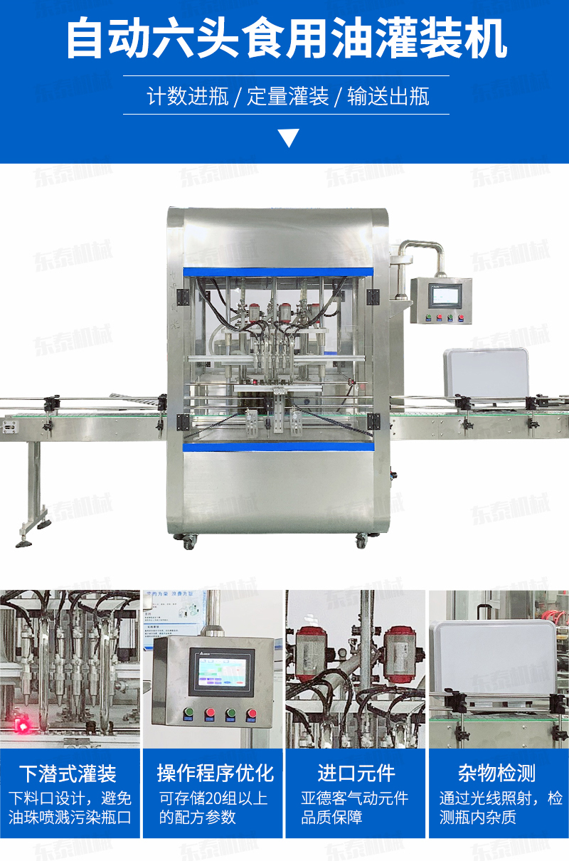 6、采用下潛式灌裝,在桶口以內(nèi)約5-8mm 處進(jìn)行灌裝,避免了灌裝速度快產(chǎn)生細(xì)小油珠噴濺污染瓶口的現(xiàn)象產(chǎn)生。配合多段式快慢速灌裝,可以保障高速灌裝時(shí)全速灌裝,又可有效解決氣壓過高快速灌裝時(shí)泡沫溢瓶現(xiàn)象,自我保護(hù)更安全,穩(wěn)定,延長(zhǎng)設(shè)備使用壽命。
