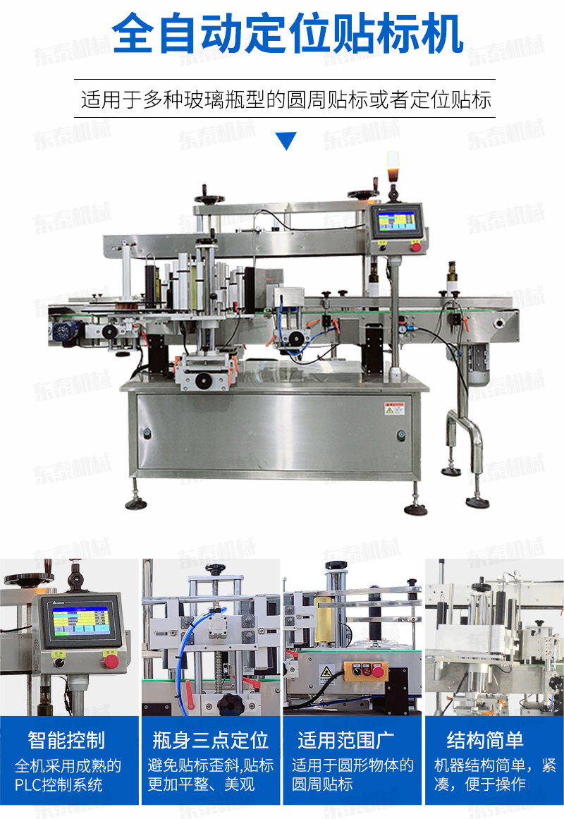 本機(jī)適用于食品、醫(yī)藥、化妝品及其它輕工行業(yè)中的扁瓶貼標(biāo)、方瓶貼標(biāo)、圓瓶貼標(biāo)之理想設(shè)備。功能操作簡(jiǎn)單,結(jié)構(gòu)緊湊。采用光電檢測(cè),PLC控制,觸摸式軟件操作,輸送帶、扶正帶、頂帶、卷瓶帶均為無級(jí)變頻調(diào)速,具有貼標(biāo)準(zhǔn)確、精度高等優(yōu)點(diǎn);同時(shí)具有無物不貼標(biāo),無標(biāo)自動(dòng)校正、自動(dòng)檢測(cè)等功能。本機(jī)既可單機(jī)使用,也可與其它包裝機(jī)自動(dòng)連線使用。
