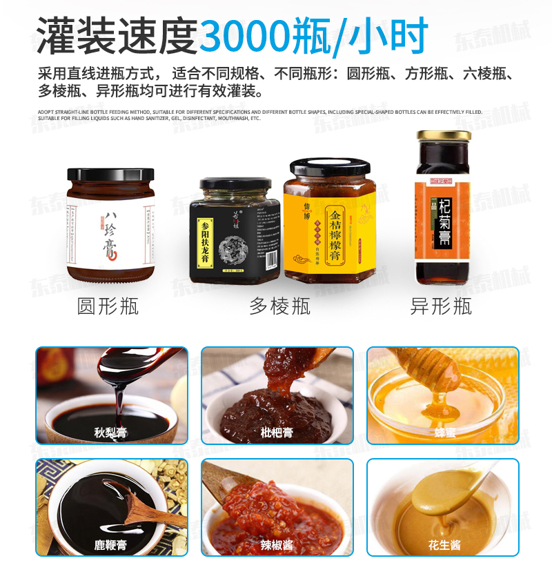 蜂蜜灌裝機設備廠家憑借著自己特有的操作設計使得該機簡單,維修方便,穩(wěn)定性強,運行速度快等優(yōu)勢,為商品生產(chǎn)廠家節(jié)約了生產(chǎn)成本和時間的同時,也為各行各業(yè)帶來了更多的經(jīng)濟效益,自動化蜂蜜灌裝機而且隨著應用的增多,技術、性能也有很大的提高,提升了整體行業(yè)的水平,尤其一些創(chuàng)新、技術開發(fā)等積極性行動,對整個企業(yè)的發(fā)展非常有利,并且蜂蜜灌裝機設備廠家還想到了避免由于原材料過多的與人接觸所造成的污染,對該機采用了全不銹鋼制作極大的保證了商品的生產(chǎn)質量。因此,自動化蜂蜜灌裝機的出現(xiàn)為不少商品生產(chǎn)廠家增加了經(jīng)濟利潤。
